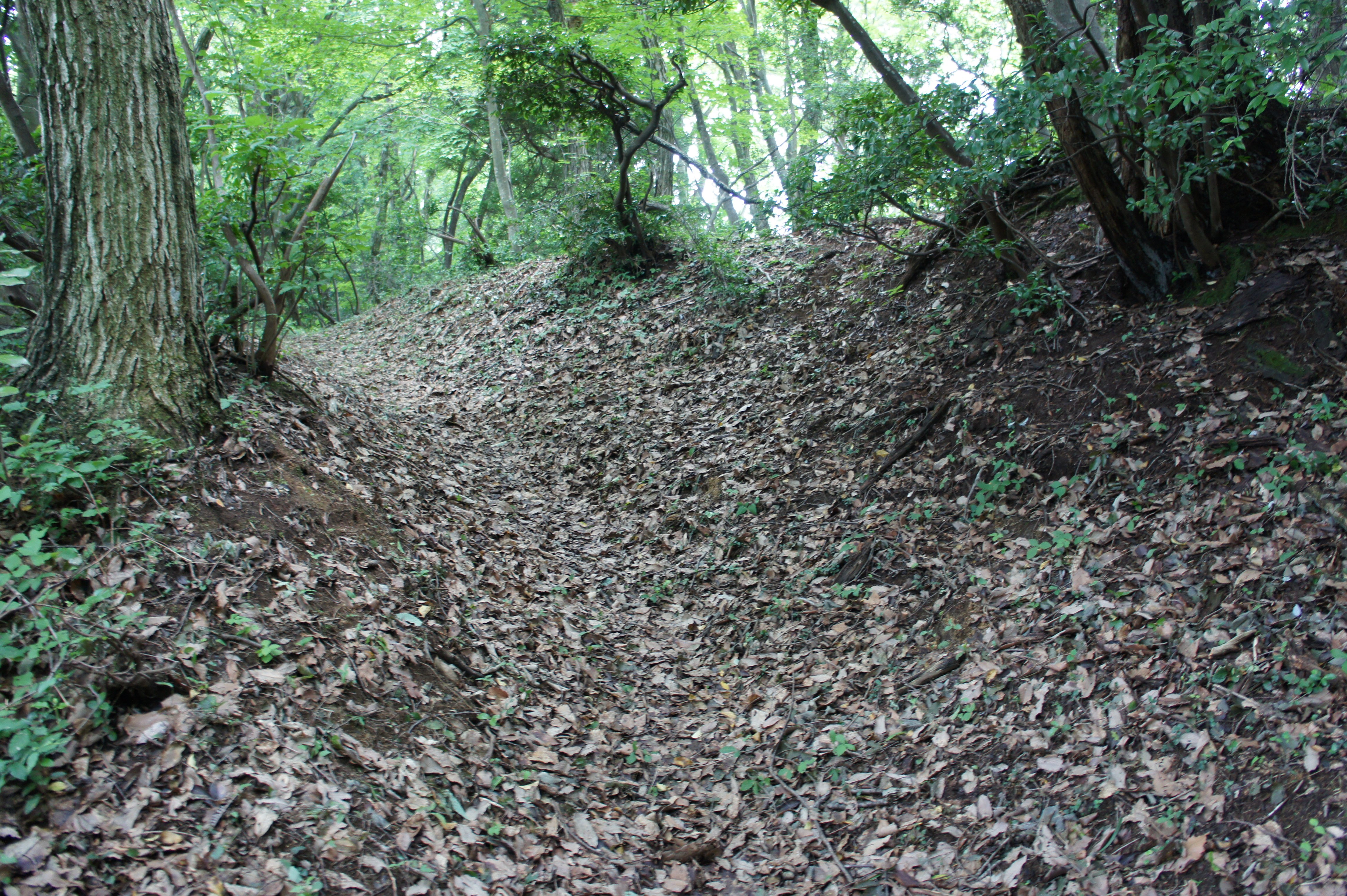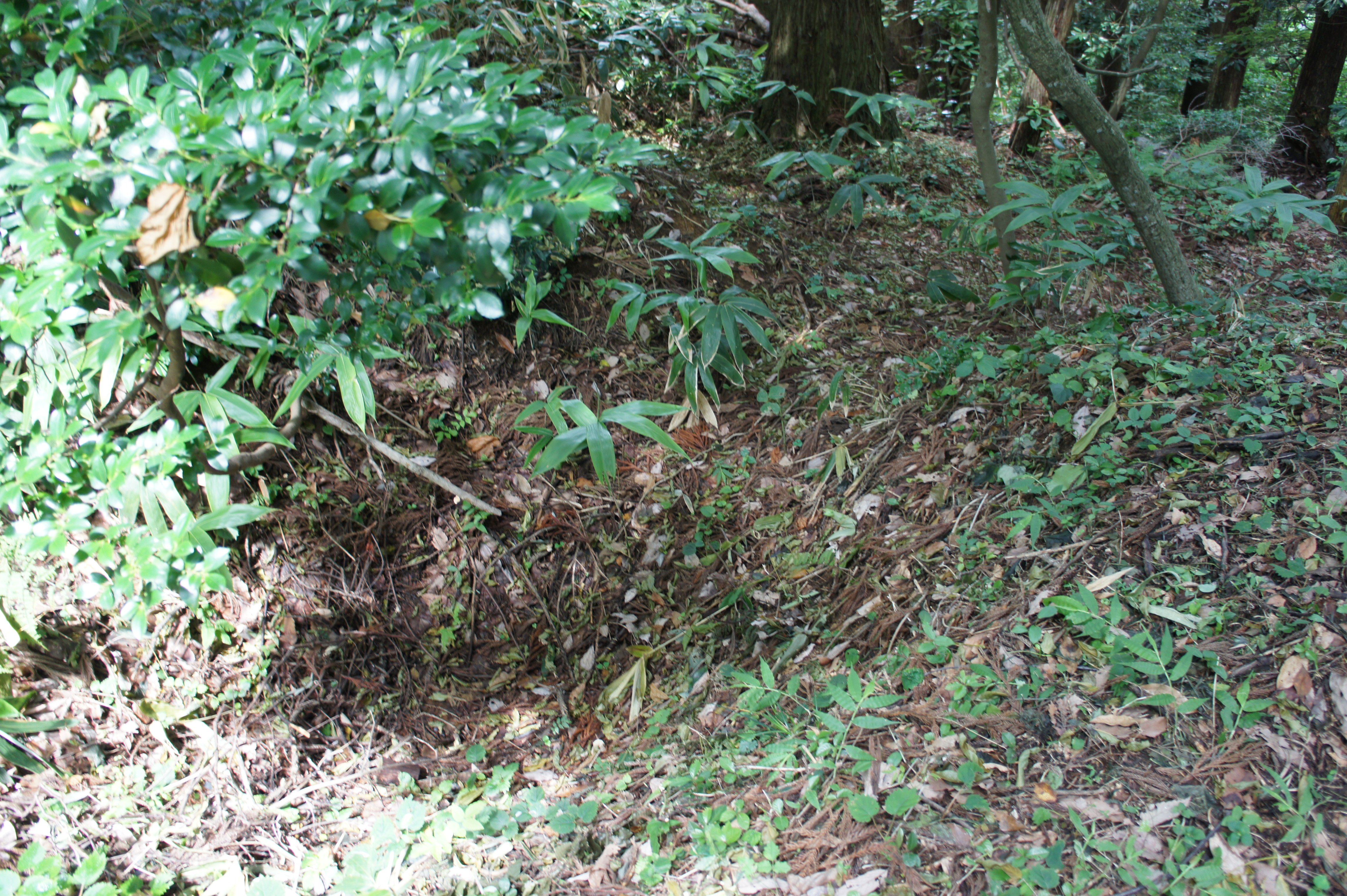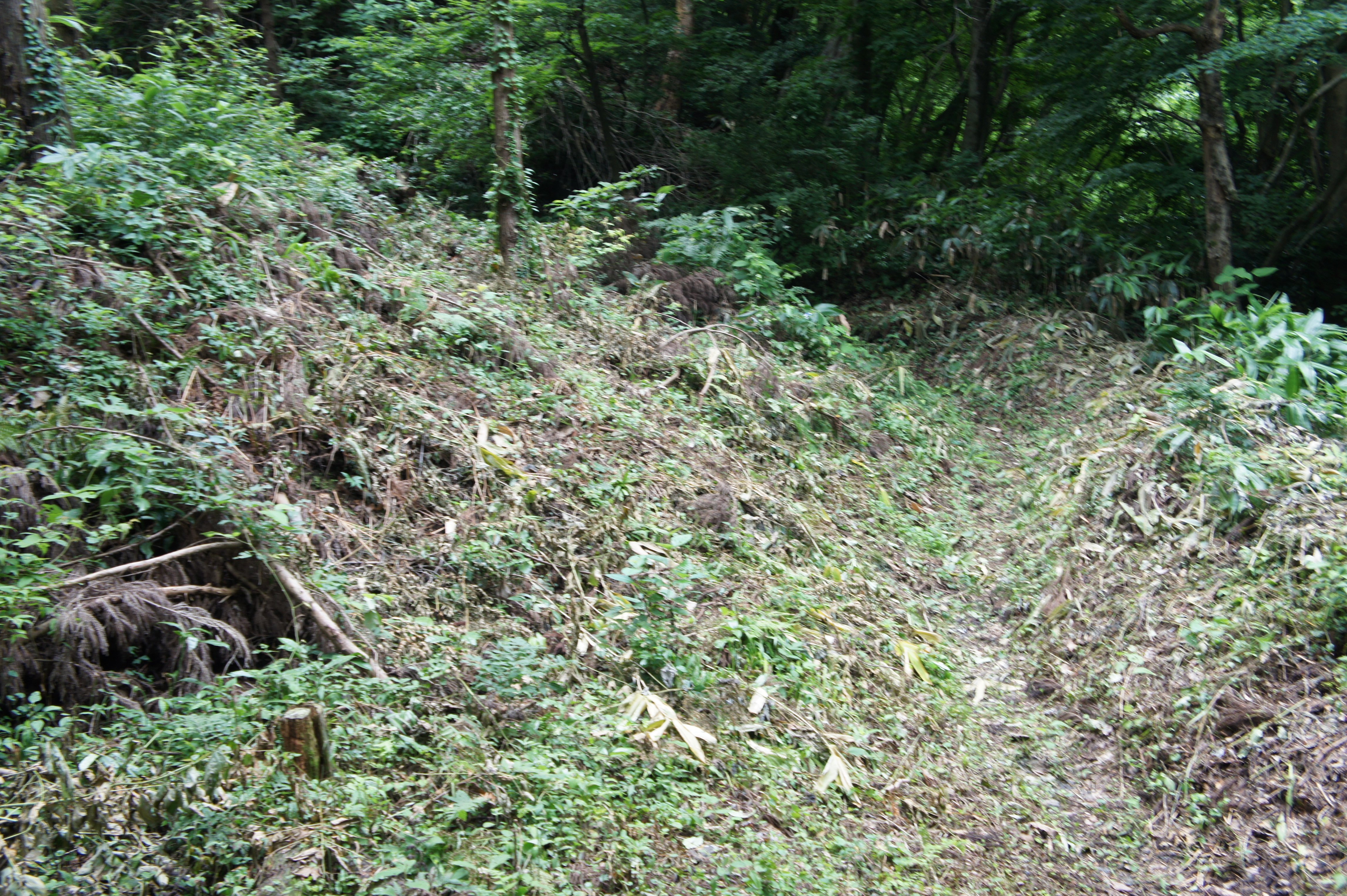 主郭手前の堀切と古池跡はこの城随一の遺構ですが、実はここからすぐに主郭に入るのではなく、右へ迂回して段郭側から主郭に入るのが大手なのですが、そこまでの整備はまだ進んでいないのが残念です。