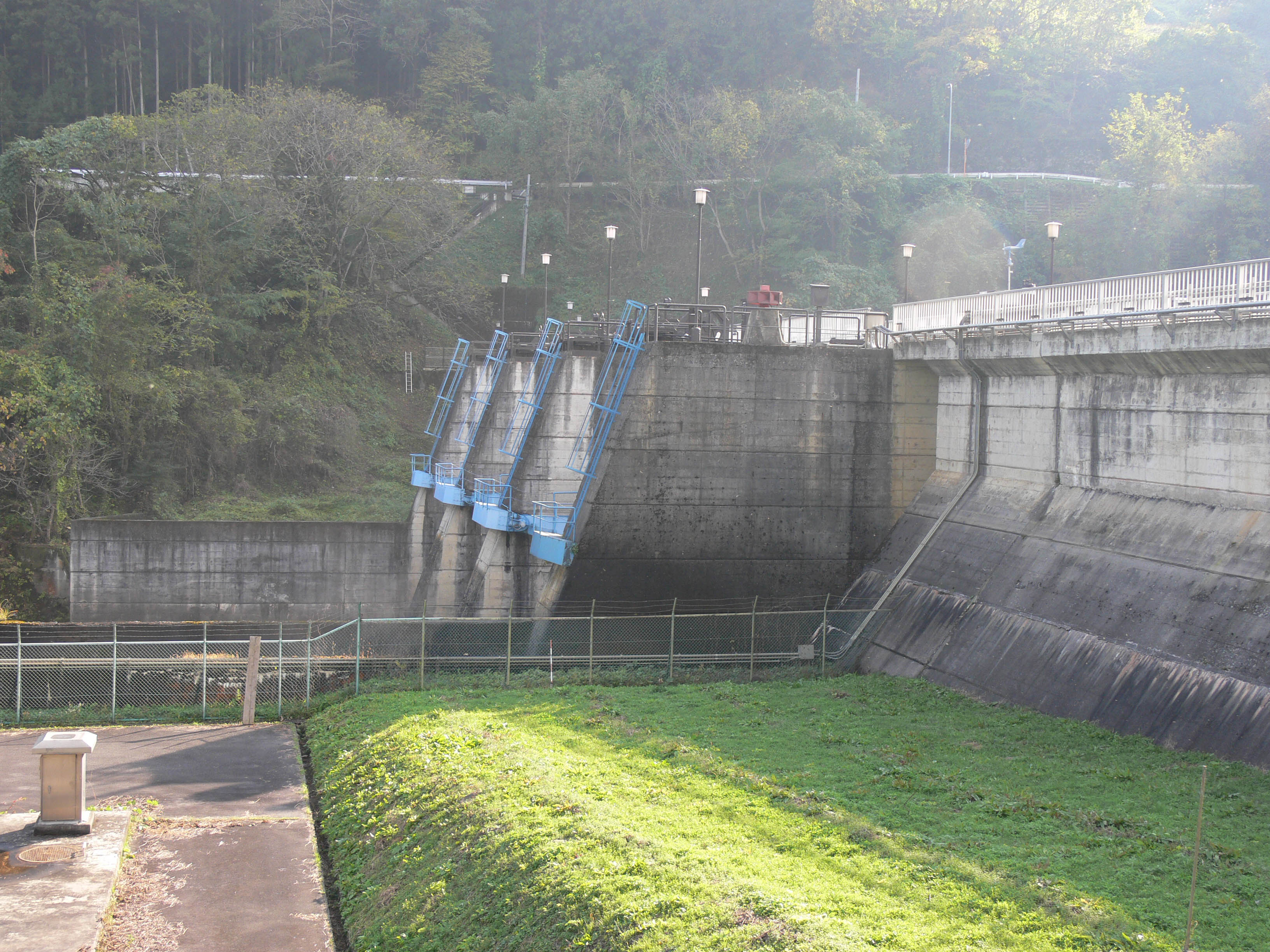 左岸上流側から堤体を見る ラジアルゲートがわずかに開いています
