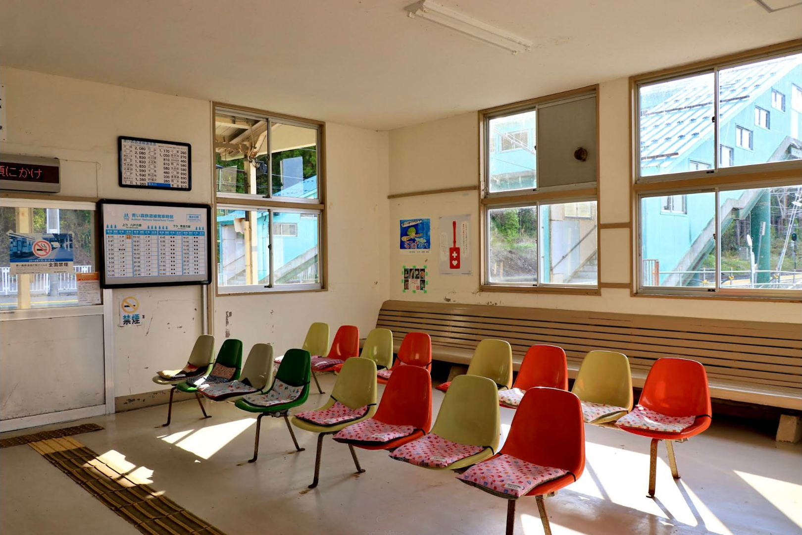 上りホーム側に駅舎があり、現在は待合室部分が開放されており、出札窓口は板で塞がれている。