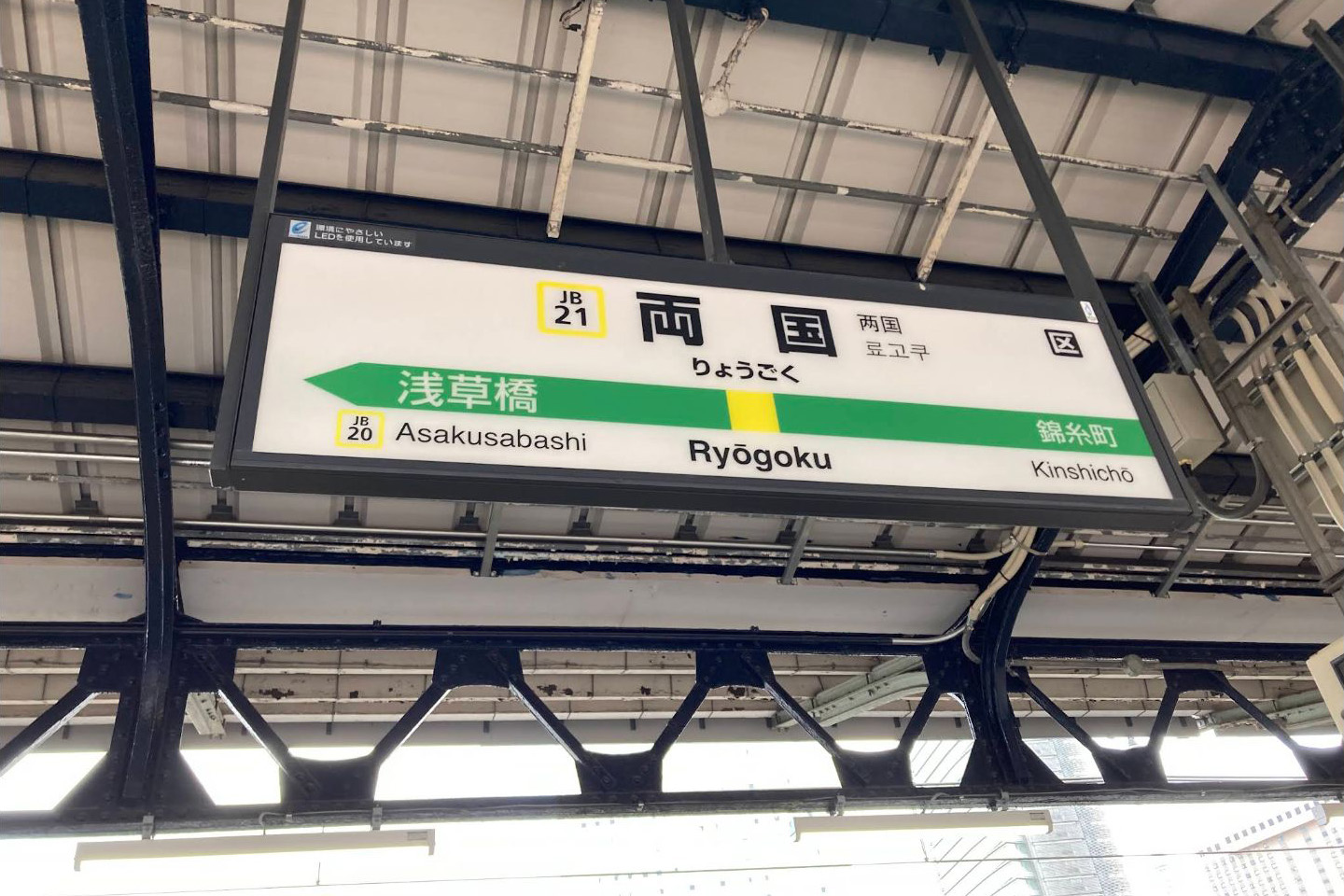 近くに大相撲興行などが開催される両国国技館があることにちなみ、西口の駅入口にある駅名表示は根岸流の書体で「両国駅」と書かれ、西口改札横には優勝額が展示されている。
